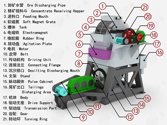 采用特殊的開放式磁路設(shè)計(jì),實(shí)現(xiàn)了磁場(chǎng)強(qiáng),磁場(chǎng)作用深度大,磁場(chǎng)梯度合理,具有處理量大、礦物不堵塞、分選效果好等特點(diǎn)。