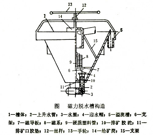 磁力脫水槽按磁性分類為永磁脫水槽和電磁脫水槽兩種,磁力脫水槽是由磁體、磁導體、排礦裝置、給礦筒、空心筒、槽體、返水盤等組成。