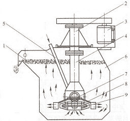 1、刮板;2、軸承體;3、電機;4、中心筒;5、吸氣管;6、槽體;7、主軸;8、定子;9、葉輪。