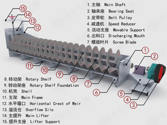 螺旋分級機具體界定為溢流堰位置高于螺旋軸下端的軸承中心,但低于溢流端螺旋的上緣的為高堰式螺旋分級機,它具有一定的沉降區域,適用于粗粒分級,可以獲得大于0.83至0.15毫米的溢流粒度;溢流堰低于溢流端軸承中心的為低堰式螺旋分級機,它沉降區面積小,溢流生產能力低,通常不用于分級作業,而用來沖洗礦砂進行脫泥;溢流端的整個螺旋都浸沒在沉降區的液面下的為沉沒式螺旋分級機,其沉降區具有較大的面積和深度,適用于細粒分級,可以獲得小于0.15至0.07mm的溢流粒度。