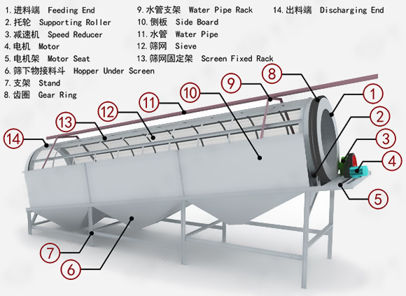 滾筒篩主要有電機、減速機、滾筒裝置、機架、密封蓋、進出料口組成。筒體一般分三段,可視具體情況而定,篩孔由小到大排列,每一段上的篩孔孔徑相同。為了提高篩分效率,物料在滾筒篩內移動的速度不能太快,否則將造成篩分不充分、不徹底,因此滾筒篩一般都有嚴格規定的安裝傾角,通常來說角度為5°,在實際情況下,可根據需要進行調整。滾筒段是通過螺母、螺釘與滾筒篩轉盤相連接的,因此滾筒段的安裝與拆卸比較方便。由于滾筒段與轉盤相連,當轉盤在驅動裝置的驅動下發生轉動時,滾筒段也跟著一起轉動。